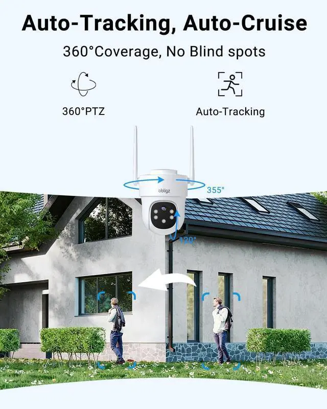 [Always On Video, 24H Recording Camera] Unlike standard solar camera outdoor wireless that record only on motion events, Obligz AOV outdoor camera achieves continuous 24 hour recording via intelligent frame rate. When detected person, it activates 25fps high-frame-rate recording; otherwise, it maintains low-frame-rate recording (7 adjustable levels) to achieve 24 hr surveillance monitoring. ^^ [365 Automatic Human Tracking] Featuring a 355 horizontal rotation and 90 vertical tilt range. When human motion is detected in target zones, Obligz security camera outdoor automatically focuses on and tracks the moving people to record the whole event.