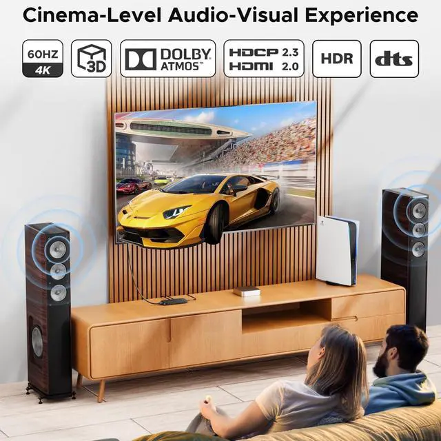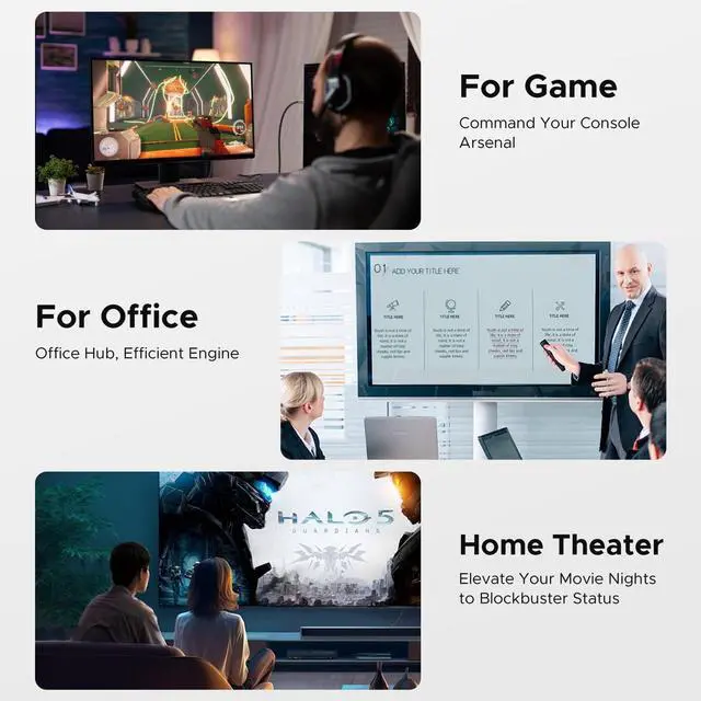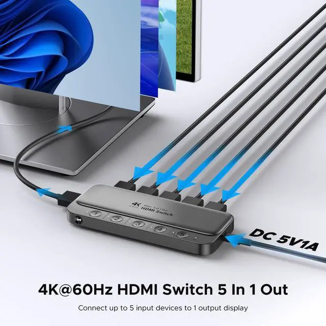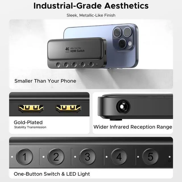 [5-In-1 HDMI Switch] Connect up to 5 HDMI deviceslike gaming consoles, TVs, and DVD playersto a single display. Easily switch sources via HDMI Switcher with remote control or physical buttons, 5 LED indicators clearly show the active port. Solve HDMI Port Shortage for Gaming, Home Theater, PC and more. Perfect for home entertainment centers, home theaters, gaming setups, and offices or conference rooms. ^^ [Cinematic 4K@60Hz Clarity] This HDMI switch box delivers stunning 4K@60Hz ultra-high-definition resolution output, and seamless downward compatibility. Supports HDMI 2.0 / 1.4, HDCP 2.3 / 2.2 / 1.4.
