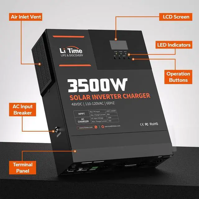 Cost Saving: The LiTime hybrid inverter 48v supports four charging modes (Solar Only, Utility Priority, Solar Priority, Hybrid), multiple output modes (Inverter Priority, PV Priority, Utility Priority) for flexible energy use. LiTime 48V 3500W reduces reliance on traditional energy sources, leading to significant cost savings.
