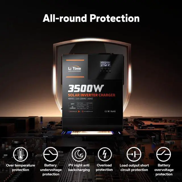 ^^ UPS Function: This 48V Inverter charger Built-in UPS function ensures uninterrupted power supply. Automatically switches to battery backup in milliseconds during outages, protecting your sensitive electronics. Compatible with all 48V battery types: lead-acid, lithium, user mode and LiTime 51.2V 100Ah ComFlex Edition battery for seamless energy management. ^^ Reliable and