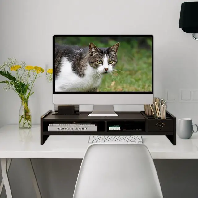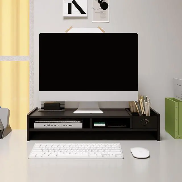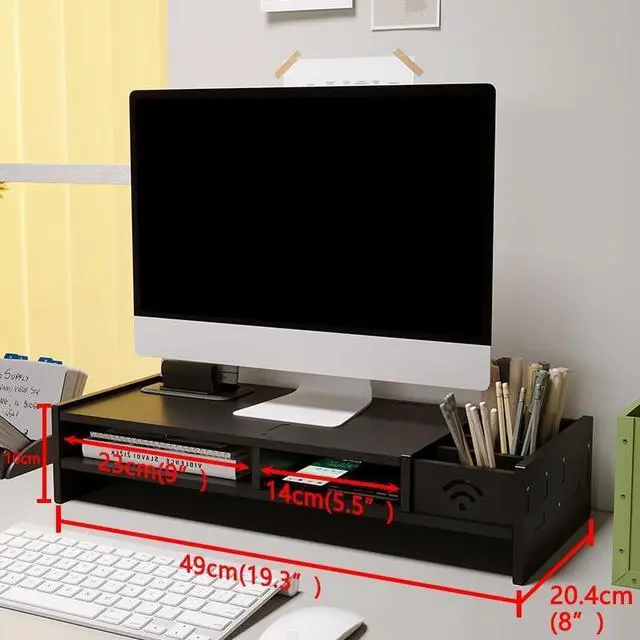 Space-saving: Under the white color of the monitor riser, we provide you with extra space for a keyboard or other office supplies ^^