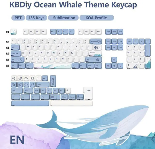 KBDiy KOA Profile-KOA Profile similar to MOA Profile, Ergonomic Arc layout, concave arc, fingers contact the keycaps in a larger area, the touch is smoother, making you feel more comfortable when using ^^ Accessories Included-This keyboard keycap set consists of 135, Keycaps do not include the keyboard. The keyboard in the picture is for display purposes only. Blue and white keycaps make up the Ocean Whale series, you can DIY your own unique keyboard ^^ Dye Sublimation PBT Keycaps-The patterns on the keycaps use dye-sublimation technology to never fade. Keycaps with thickness will make users feel more texture.