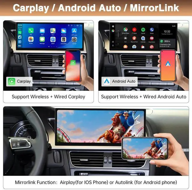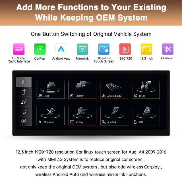 ^^ Car Upgrade Screen for Audi A4 A5 Built-in Wireless/Wired CarPlay and Android AutoUse your phone in safety while you drive. By simply saying ""Hey Siri"" or ""OK Google"", to get directions, make calls, send & receive messages, and enjoy your favorite music. Get access to voice commands, Siri & Google Assistant can help you do all of these things. ^^ Dual Systems for CarNot only retain the original OEM system functions, but also add wireless Carplay, Android Auto and mirrorlink Functions. One-click Dual-system Switch Seamlessly switch between Linux and original car systems.