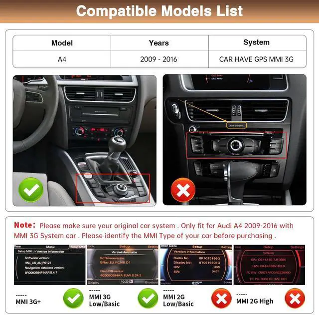 Pre-shopping NotesThe car carplay touch screen for Audi A4 A5 2009-2015 Year with 3GMMI System, Not fit for 2G MMI or without GPS System. Pls Confirm the system and car model to buy!!! If you are unsure, pls ask for help from us. ^^ 12.3 Inch 1920*720P Touch Screen Display With the IPS display touch screen, high-resolution image quality. The HD display delivers outstanding clarity, contrast, and brightness. Catch every single sharp, vivid, and vibrant picture from virtually any vantage point; It supports AHD 720P/CVBS NTSC/PAL camera.