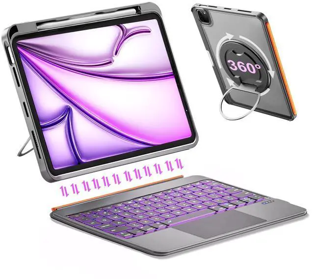 Backlit Keyboard: With flexible magnetic detachable keyboard, the ipad pro keyboard case transforms iPad into a laptop in 1 second, allowing remote typing up to 33feet away. Seamlessly switch between work & leisure. Enhance mobile productivity in any environment with 7 customizable backlight colors, from dark planes to bright coffee shops. ^^ Innovative 360 Rotatable