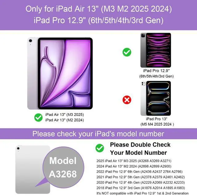 Compatibility: The ipad air keyboard case is only compatible with iPad Air 13 inch (M4 2026, M3 2025, M2 2024), iPad Pro 12.9 inch 6th/5th/4th/3rd Generation.