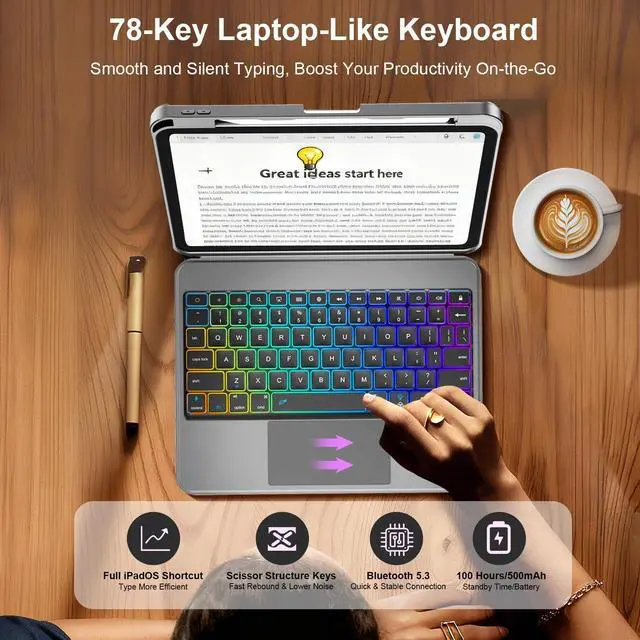 Silent & Efficient Typing Pro: Enjoy a whisper-quiet and comfortable typing experience on the 78-key scissor-switch keyboard. A dedicated row of iPadOS shortcuts boosts work efficiency in documents and coding. This seamless workflow is powered by Quick-Pair Bluetooth 5.3 for a stable, lag-free connection and a long-lasting 500mAh battery that provides up to 100H of standby. The wireless keyboard for ipad is ideal for mobile offices, classrooms, or home use. ^^ Slim, Lightweight
