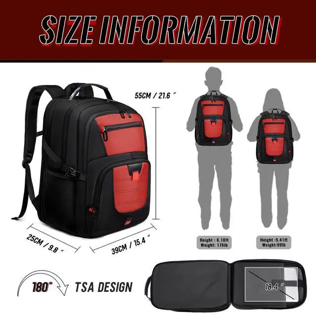 INCH LAPTOP COMPATIBILITY & PROTECTION: Engineered for oversized tech, this pack features a massive compartment that fits 18.4" gaming laptops like Alienware and MSI. The internal vault is fortified with 360 high-density foam padding and a "Suspended Cradle" system that prevents your device from hitting the ground. It is the ultimate insurance for keeping your expensive hardware safe from drops, shocks, and scratches during every commute and travel. ^^ 55-60L EXTRA LARGE CAPACITY & MODULAR ORGANIZATION: Boasting a staggering 55-60L of storage, this rucksack is a true "travel trunk" on your back. It features 20+ specialized pockets and 3 main compartments to hold a weeks worth of clothes, keyboards, VR headsets, and textbooks simultaneously. The deep, wide-body design ensures bulky items fit without straining seams. Whether you are a digital nomad or a student with a heavy load, this bag provides the space you need. ^^ TSA FRIENDLY DESIGN & SEAMLESS AIR TRAVEL: Navigate airport checkpoints like a pro with our 180 lay-flat TSA design. This oversized pack opens quickly for X-ray scanning, allowing you to keep your 18.4" -19" laptop inside. Dimensions are optimized as a carry-on for most international flights. The heavy-duty luggage sleeve allows you to slide the pack over suitcase handles, transforming a heavy load into a balanced, hands-free travel experience across global terminals and commute stations. ^^ ADVANCED TECH HUB & ERGONOMIC WEIGHT DISTRIBUTION: Stay connected with integrated USB-C and USB-A charging ports for high-speed power pass-through. Weve engineered an elite ergonomic system featuring multi-panel airflow padding and S-shaped reinforced straps. The adjustable chest strap and load-lifting buckles distribute weight across your torso, preventing back strain and ensuring "zero-gravity" comfort even when fully loaded with tech gear and travel essentials.