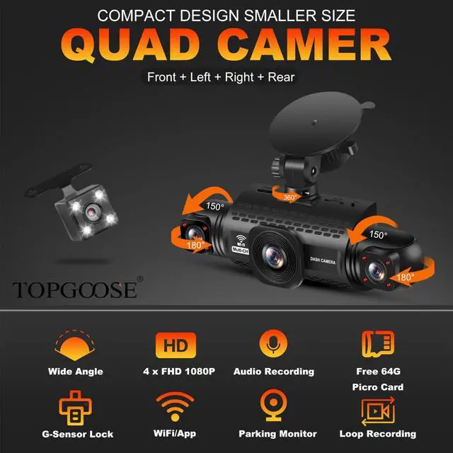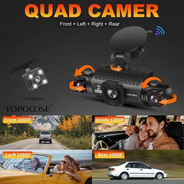 • 360 All Sides Dash Cam 4 ChannelThe TOPGOOSE 4 Channel dash cam has 4 lenses, all capable of recording FHD 2K video simultaneously. It can capture the front, rear, left, and right sides of the vehicle simultaneously. The front 4 lenses can adjust the shooting angle so you can capture more details as you like. It can easily cover 360 degrees, ensuring that there is no dead angle around the car. You can use one lens to capture the interior of your vehicle.