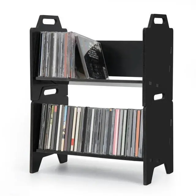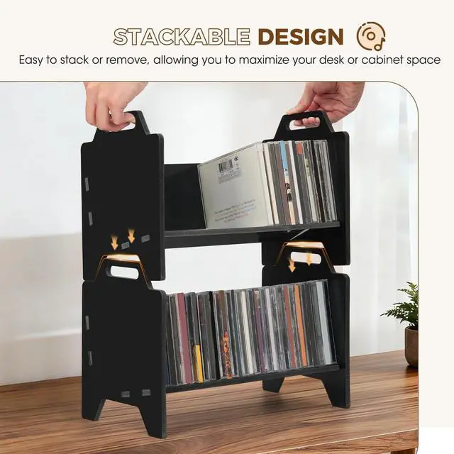 Large Capacity The 2 pack CD holder holds up to 56 CD cases in a compact space that keeps your CD cases neat and organized in any room or workspace ^^ Space Saving Stacking - Individual CD holder rack can be stacked vertically like building blocks, maximizing vertical space. Easily expand capacity to meet categorized storage needs for large cd collections, ideal for limited spaces ^^ Independent CD Access - Even when stacked multiple CD storage shelf high, books on any level (individual unit) can be taken out or put back conveniently and independently, without needing to move upper units or the entire stack ^^ Flexible Placement - Use 1 or 2 CD holder as a desktop bookshelf to keep daily reads within reach, or stack multiple units as a floor bookshelf for categorized book storage ^^ Sturdy Material Made from lightweight and sturdy PVC foam board, the CD storage tower is built to be sturdy and long-lasting.