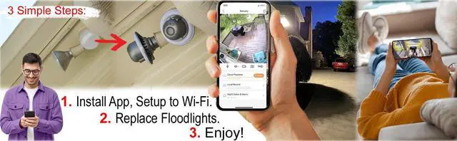 Replace your existing floodlights with our new and innovative All-in-One Floodlight Security Cameras. US Patent Approved Product. US Trademark Acquired. ^^ Secure your home in just a few minutes. 100% wire-free installation. Very simple and quick to set up. Just take down your old floodlights and install our new floodlight cameras. ^^ Fully Functional 600 Lumens Floodlight with 4 different control modes (Manaul/Motion/App/Timer Controlled). Professional 1080P Panoramic Security Day/Night All-in-One Floodlight Camera. ^^ Maintain your original floodlight's indoor on/off power switch functionality plus App & Motion control to the floodlight.
