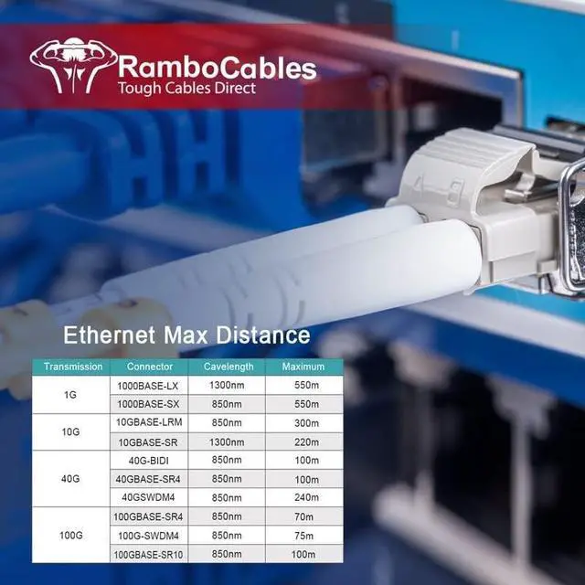 RamboCables OM4 SC-LC optic fiber patch cables help saving more space for your high density cabling in data centers, enterprise networks, telecom room and any places patch cables are needed. ^^ Transmission DistanceOM4 SC to LC fiber patch cables have a 4700 MHzkm @850nm bandwidth, allow for 10Gb Ethernet transmission distance of 400Meters at 850nm wavelength; 40Gb Ethernet transmission distance of 350Meters at 850nm wavelength; 100Gb Ethernet transmission distance of 125Meters at 850nm wavelength. ^^ Why to ChooseOM4 SC to LC multimode fiber optic patch cables are Constructed with LSZH environmentally friendly Jacket.
