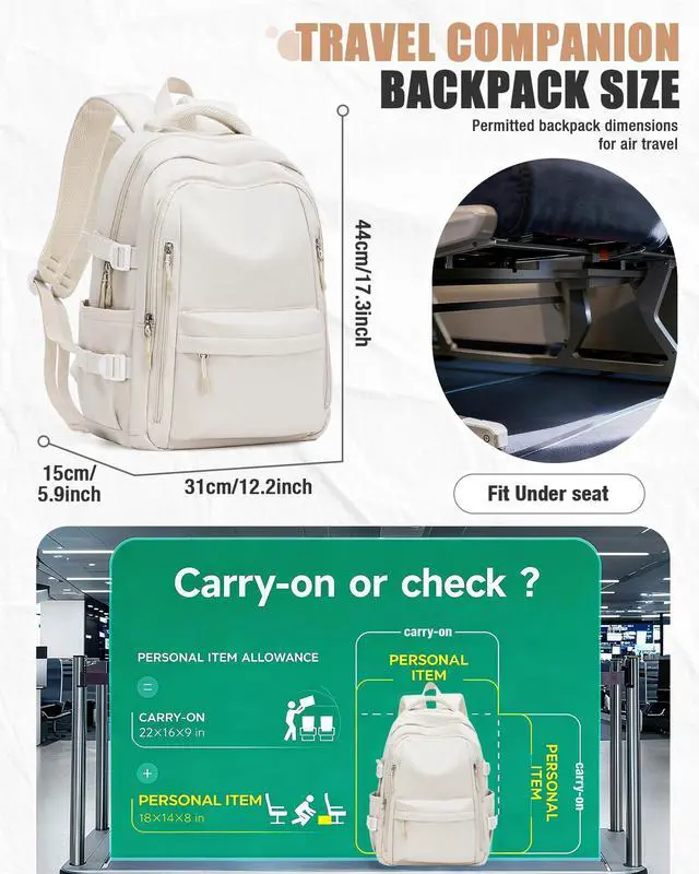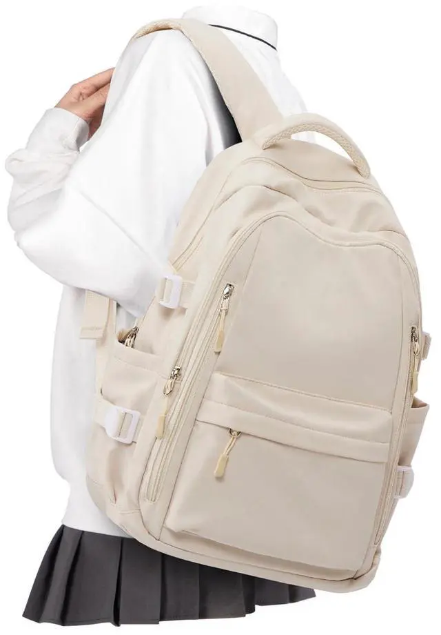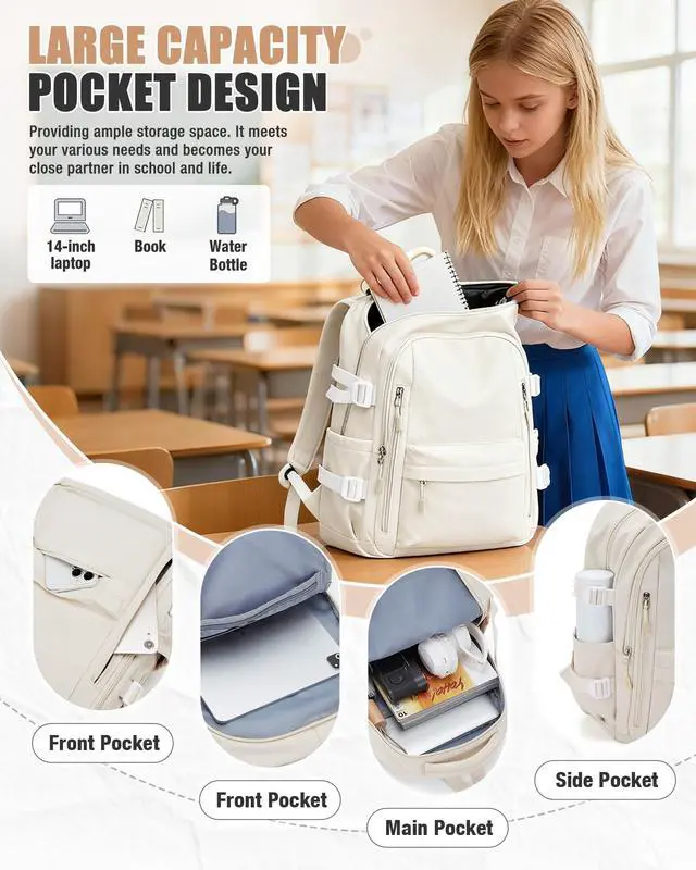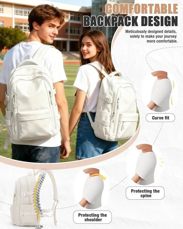 Large Storage SpaceThe Lightweight Backpack has large -capacity main pocket x1, laptop computer pocket x1, front zipper pocket x3, side pocket x2 and back anti-theft zipper pocket x1. The spacious compartments and multiple pockets make your items well-organized and easier to find.