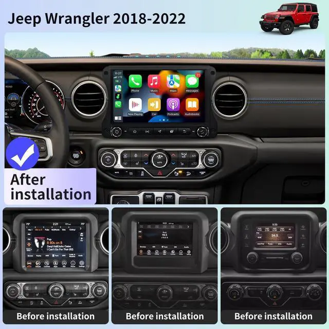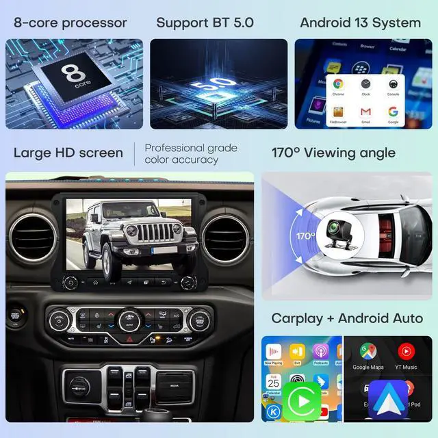 Car Radio Stereo for Jeep WranglerThis Android car radio is suitable for Jeep Wrangler JL & Gladiator JT 2018-2022. UPGRADED Android 13 operation system + 8 Core CPU + 4G RAM +64GB ROM with enhanced fluency. Equipped with a 10-inch large screen, you can better control this machine. 100% standard size, no need to purchase additional accessories, just follow the installation instructions to make your car a new look. ^^ Kind One-on-one ServiceIf you are not sure if your vehicle model is suitable for installation, you can send us a picture of your car's central control before purchasing, and our engineers will confirm and reply to you as soon as possible.