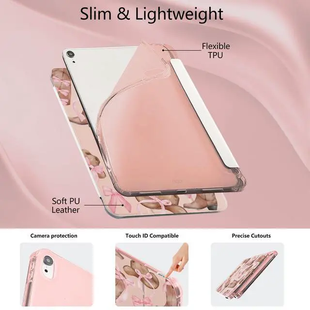Adjustable angle: The trifold stand shell design of this pink bowknot lovely case for apple ipad can easily change the angle to meet your viewing and typing needs. This fashion aesthetic case for ipadcan be folded into a stable triangle, firmly supporting your pad. Whether it's work, study, or watching movies, they can meet your needs ^^