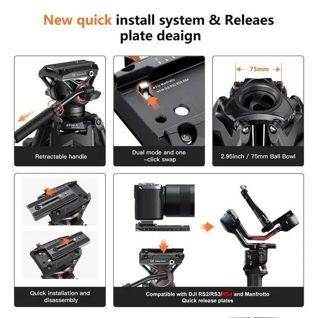 Heavy Duty Metal Video Tripod COMAN camera tripod made of high quality aluminum alloy, is sturdy and durable, and the adjustable bowl seat at the bottom of the fluid head makes it stable on most surfaces, ideal for field and landscape photography or outdoor video shooting and film making ^^ Upgrade Quick Installation System Compared with the traditional slide-in structure, press the QR plate directly from the top of the head and lock it within 1 second, or you can quick locking and releasing of the pull bolt the QR plate via the side, convenient to switch between tripod and gimbal shooting, for photographers quickly place the camera ^^ New Q6 Fluid Head Newly-upgraded Q6 gimbal is compatible with DJI RS2/RS3/RS4, Manfrotto quick release plate, supports 360 panoramic view and +90 /-60 tilt, Its 75mm diameter bowl shaped base and head locking handle allow the head to slightly move up and down to fit uneven ground, which can bring a good feeling for smooth operation and easily capture stable and smooth videos ^^ Folding Board Video tripod equipped with folding board, more possibilities for angle locking to switch between horizontal and vertical lenses, and the quick plate with spanner inside design, allows the photographers attach the camera quickly without any other tools ^^ Adjustable Height 360thickened footbed, anti-skid design, fully applicable to complex terrain.