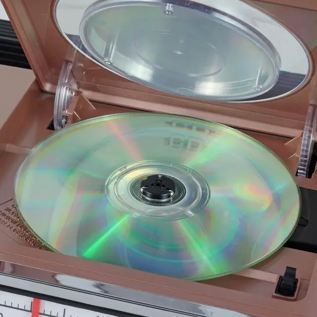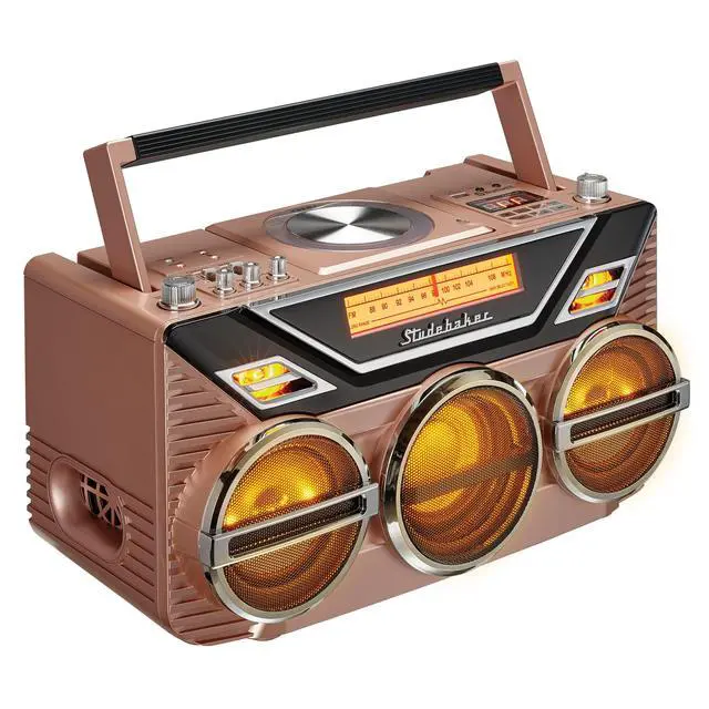 Bluetooth Receive and Transmit ^^ Top Loading CD Player with 20 Programmable Tracks for CD/MP3 and USB Playback ^^ 15W Subwoofer for High Power Bass ^^ 3 Speaker System ^^ USB Port for Playback (USB Drive up to 32GB) ^^ FM Stereo Analog Radio with Backlit Dial Scale ^^ Rotary Volume / Bass / Treble Knobs ^^ Aux-in Jack, Headphone Jack, DC Jack ^^ Amber LED Light Effects that Synchronizes with Music across 5 Speakers ^^ Rechargable Battery / AC Adaptor