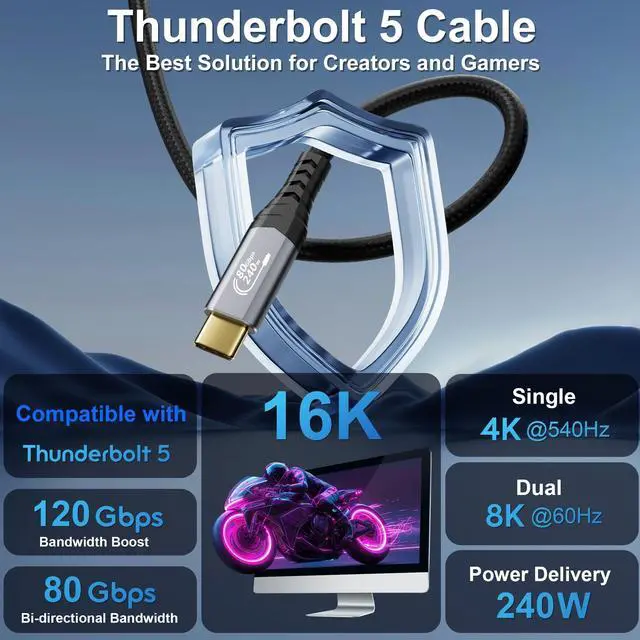 Thunderbolt 5 cable, 80Gbps high-speed transmission, directional bandwidth up to 120Gbps, supports 16K dual 8K HD video output, easily enabling multi-screen connectivity. 240W high-power charging, compatible with Thunderbolt 4/3, USB4 v 2.0, and other devices, suitable for daily office, entertainment, and multi-scenario use.