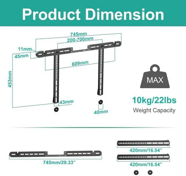 ^^ Sturdy and SafeEnsure screws are fully tightened until the entire threaded portion is in the hole and cant be tightened anymore. The anti-vibration locking patch on the screws provides additional resistance, enhancing stability during use. ^^ Simple InstallationIncludes clear instructions and all hardware setupno need to remove your TV. Position the bracket 4 inches above/below your TV for perfect sound alignment. ^^ Package Includes WALI SounbarTV Mount Bracket Kit x 1, Mounting Hardware Kit, User Manual, experienced and friendly US based customer support available to assist 7 days a week.