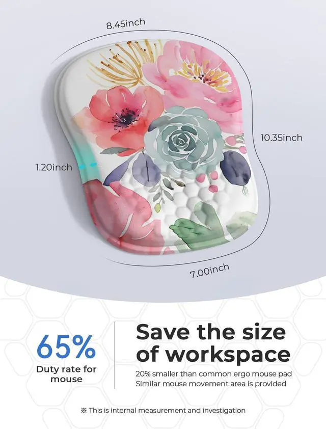 • MAXIMIZED SPACE EFFICIENCY - 65% USABLE AREA Engineered for modern desks. While traditional ergonomic pads are bulky and wasteful, our design allocates a full 65% of its total area to smooth mouse movement -- all within a compact footprint. This superior space utilization gives you the freedom of a large mouse zone without forcing you to sacrifice valuable desk real estate, making it the ideal choice for compact setups and multi-monitor workstations.