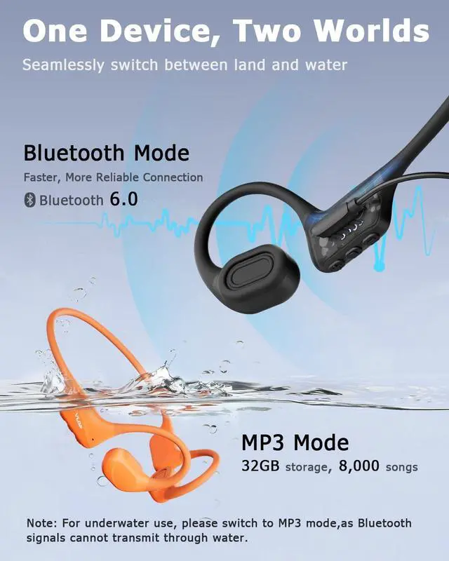 • Dual Mode: Bluetooth 6.0 & MP3 PlayerSwitch freely between Bluetooth 6.0 streaming and standalone MP3 mode. Store up to 8000 songs for phone-free listening while swimming or traveling. Low-latency wireless connection ensures smooth audio during running or cycling.