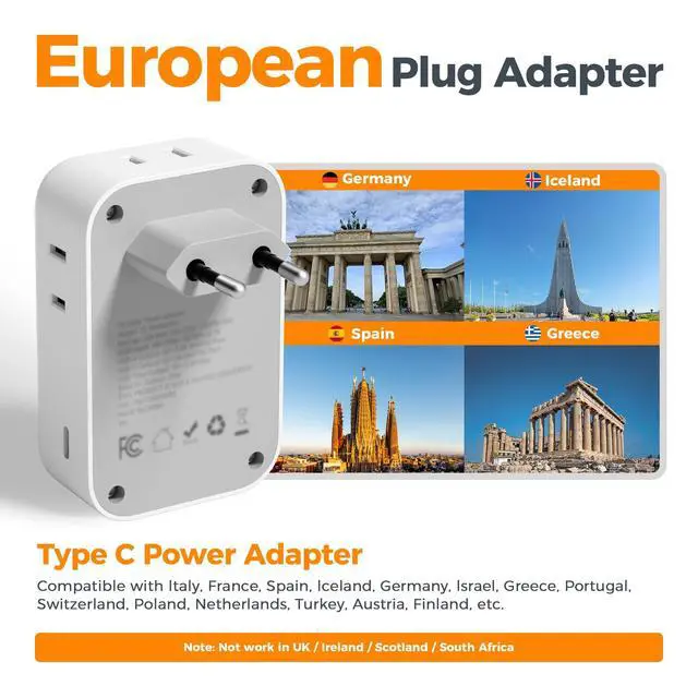 European Plug Adapter: The euro travel adapter compatible in most European countries such as Spain, Italy, France, Germany, Greece, Austria, Belarus, Belgium, Croatia, Denmark, Portugal, Poland, Netherlands, Turkey, etc; Some countries or regions use multiple socket types.