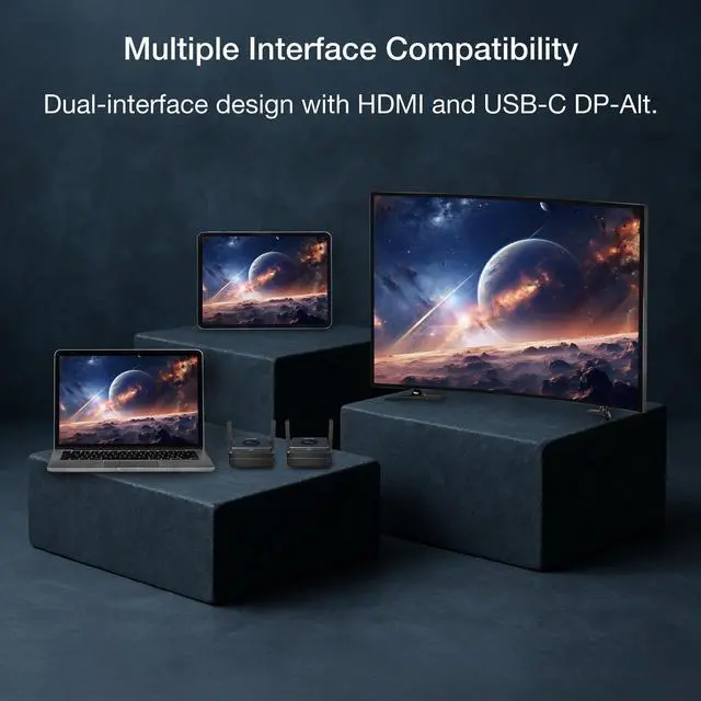 1 Strong Signal Through Walls Enjoy powerful, stable transmission that easily penetrates walls and obstacles no lag, no interruptions, even across rooms or floors. ^^ 2 800m Long Range & Ultra-Low Latency Experience real-time streaming with up to 800 meters range and under 60ms latency perfect for presentations, events, and professional use. ^^ 3 Dual Antennas for Rock-Solid Stability Advanced dual-antenna design boosts signal strength and reliability, ensuring smooth and uninterrupted performance in any environment. ^^ 4 HDMI & USB-C (DP Alt Mode) Compatibility Seamlessly connect laptops, smartphones, tablets, monitors, and more with versatile HDMI and USB-C support.