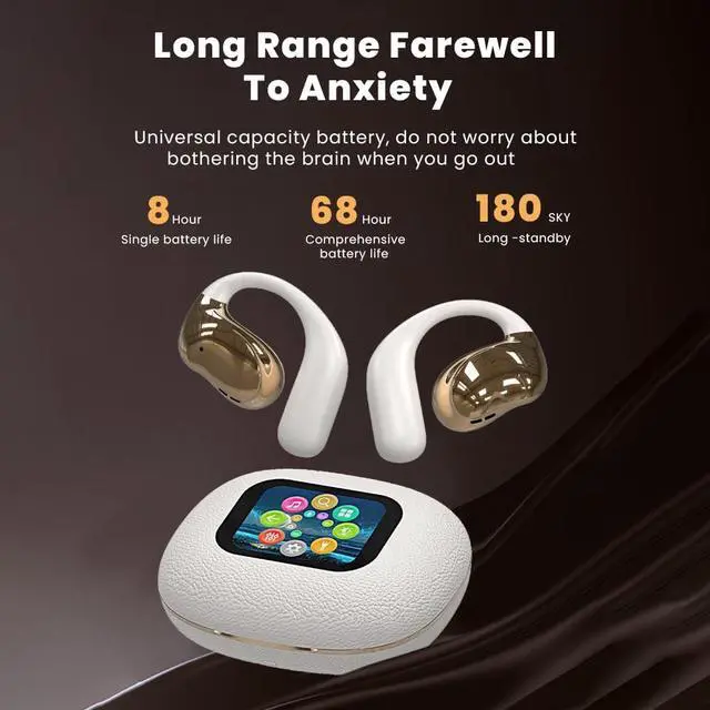LED Full-Color Smart Screen & Independent MP3 Mode: The multi-touch smart charging case of these open ear earbuds not only allows precise control over music playback, track switching, and volume adjustment, but also offers multiple EQ modes for a personalized listening experience. ^^ Intelligent Touch Screen - The earbuds feature an intelligent touch screen that allows for easy control of your music and calls, eliminating the need to fumble with buttons. Revel in your music and handle calls effortlessly, thanks to a finely-tuned microphone system designed to precisely pick up your voice while effectively reducing background noise. ^^ ANC and