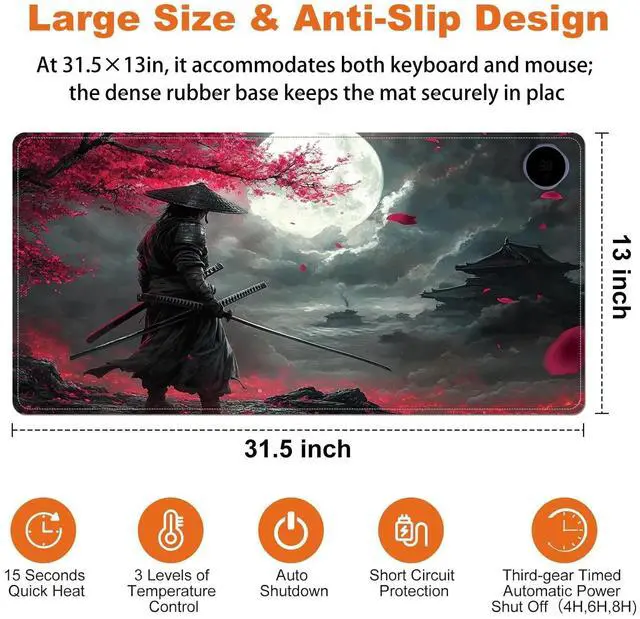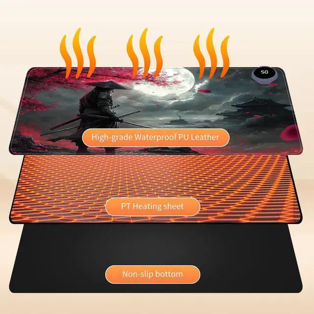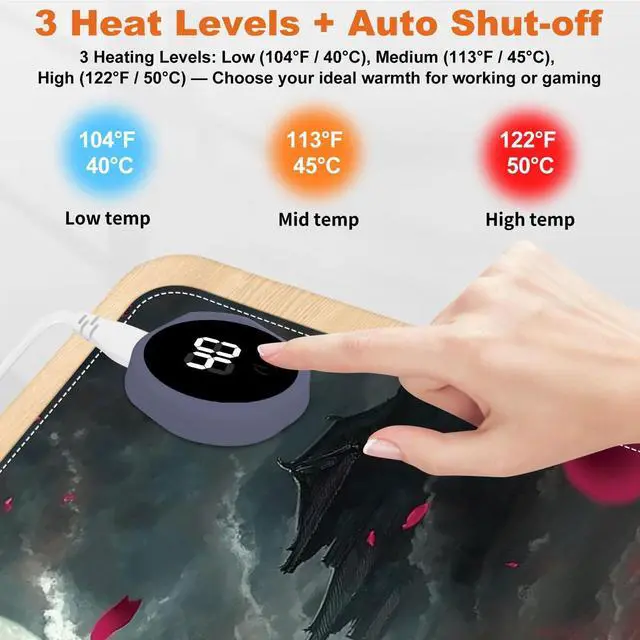 Stay warm and productive during the cold months with this large 31.5" x 13" Heated Mouse Pad. Featuring 3 adjustable heat levels (104F / 113F / 122F), it delivers consistent warmth for your hands and wrists while working or gaming. Made from premium PU leather, the surface is waterproof, easy to clean, and comfortable to the touch. Unlike USB-powered models, this desk mat uses a plug-in electric power source for faster and more stable heating. An automatic 3-hour shut-off timer ensures safety and energy efficiency. The mat is rollable and portable, making it ideal for both office and remote workspaces.