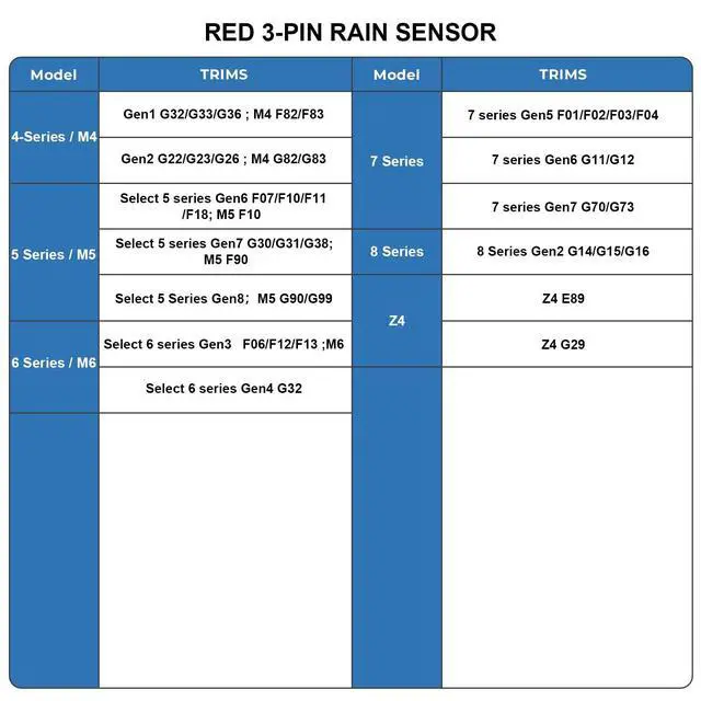 Only compatible with BMW vehicles with a factory-installed rain sensor using a dedicated, powered 3-Pin connector inside the original sensor cover. Vehicles without a rain sensor, with an integrated sensor and no separate plug, or other 3-Pin connectors that may fit, will NOT connect or power on.