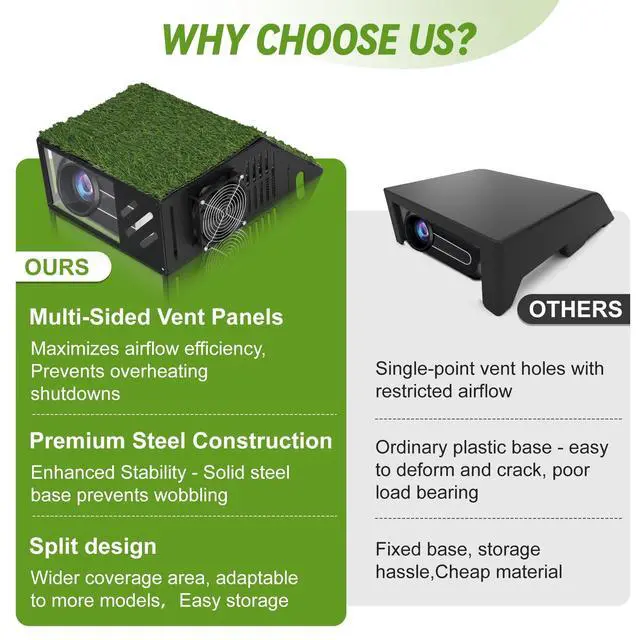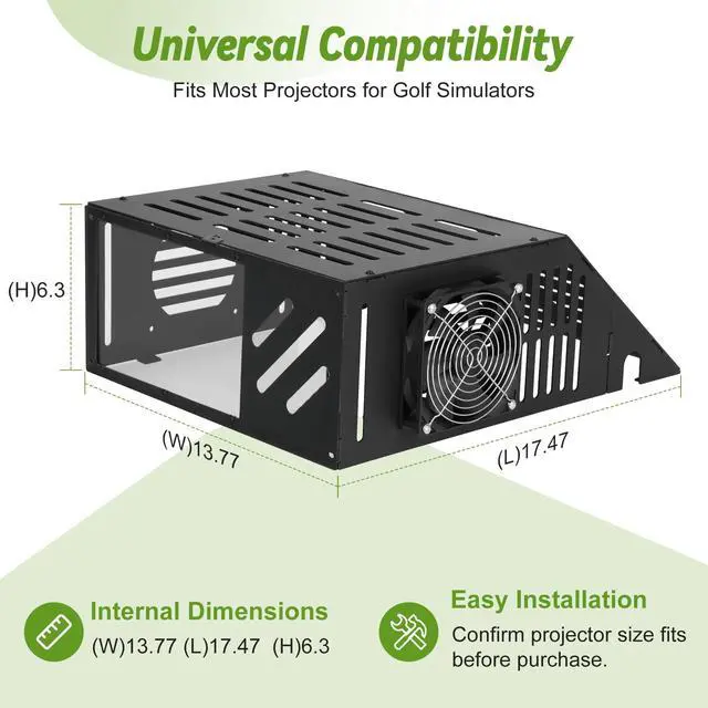 Golf Simulator Projector EnclosureA practical and cost-effective alternative to ceiling mounts. This floor-mounted projector cover lets you conveniently position your golf simulator projector on the ground while providing reliable protection from impacts and mishaps ^^ Strong Metal Frame & Cable ManagementCrafted with a heavy-duty steel frame and a durable polycarbonate panel, this enclosure ensures long-lasting strength and protection without affecting image clarity. Built-in power cord openings help prevent pinching and keep cables organized ^^ Universal FitDesigned to accommodate most standard golf simulator projectors. Please confirm that your projector fits within the internal dimensions: 13.77" (L) x 17.47" (W) x 6.3" (H) ^^ Efficient Ventilation SystemEquipped with side and top ventilation ports plus cooling fan, The golf projector floor enclosure promotes optimal airflow and heat dissipation to maintain projector performance during long practice sessions ^^ Quick & Easy AssemblyBenut floor mounted Projector Cover Comes with clear instructions and all necessary tools, allowing for fast installation and secure setup