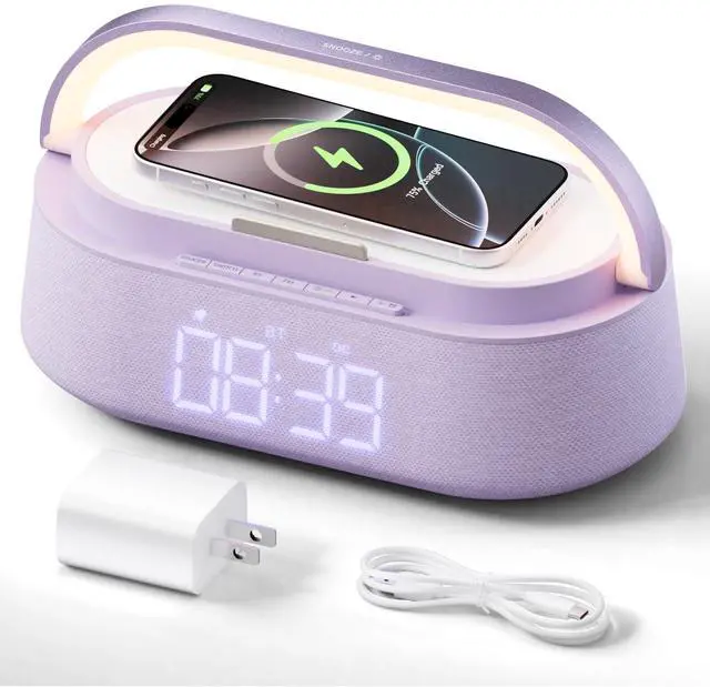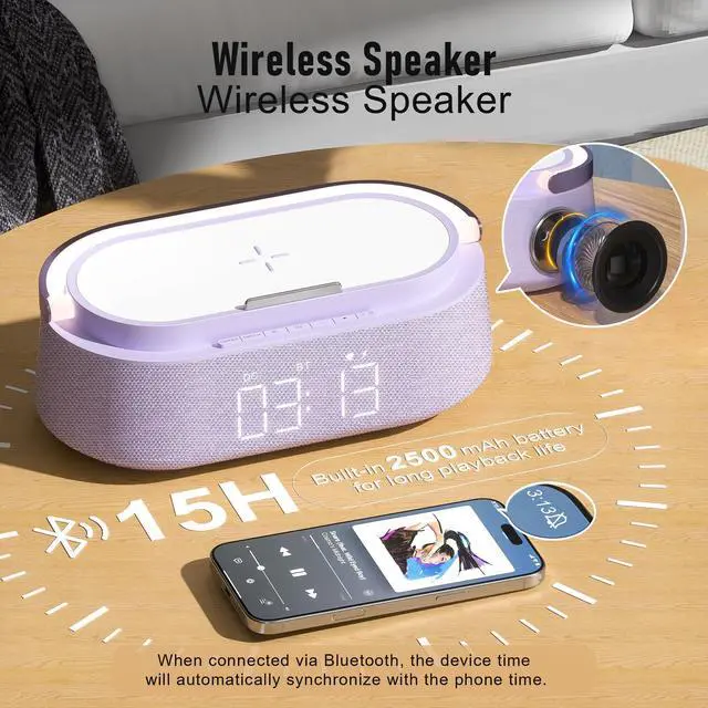 Design: FREEFISH Alarm Clock with Bluetooth speaker, wireless charger, FM radio, digital alarm clock, dimmer night light and phone holder. The multifunctional alarm clock meets most of your electronic needs in life. You are a little helper to improve the quality of life.