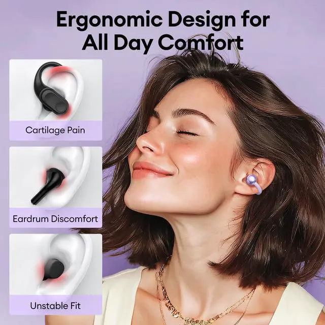 Ultra-Lightweight & Secure Open-Ear Design: Experience zero-pressure comfort with ergonomic clip on earbuds, weighing only 4.1 g per ear. The open-ear design allows natural airflow, eliminating ear canal fatigue even during 10+ hours of continuous wear. Stay aware of traffic, conversations, or gym instructions while enjoying musicperfect for runners, cyclists, and safety-conscious users ^^ Immersive Hi-Fi Sound & Crystal-Clear Calls: Powered by 14.2 mm dynamic drivers and ENC noise reduction technology, these clip on headphones deliver studio-grade audio with deep bass and crisp vocals. Advanced directional audio ensures zero sound leakage, while dual mics block 90% background noise for face-to-face call clarity even in windy environments ^^ Bluetooth 5.4 & 50H