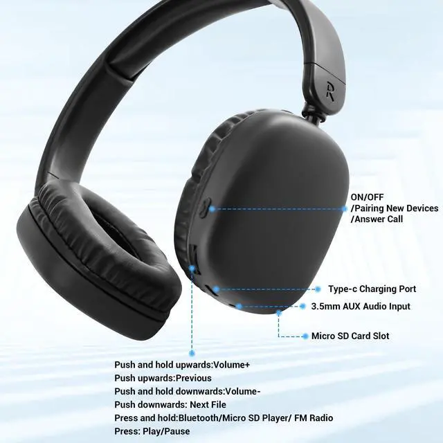 range: FM 87.5 -108MHz. You can listen to your favorite programs anytime and anywhere. ^^ [Micro SD MP3 Player] Simply add a Micro SD card for thousands of audio tracks! Enjoy music anywhere without a device connected. Listen to all your music collection and enjoy unparalleled sound quality while workout. (SD card Not included ^^ [Clear hands-free call] Using the built-in microphone call technology, you can make and receive calls very clearly, which is convenient for work. ^^ [Versatile Connectivity]headphones come with Bluetooth which makes connections more stable and faster and the effective connections up to 33Feets. Included audio cable help you continue to enjoy music without electricity, unlimited access to immersive sound at any time. ^^ [Ultra 40mm Bass Drivers] Experience deep, earth shaking bass and crystal clear audio reproduction with 40mm bass drivers frequency response for super clear mid-tones and crisp highs, perfect for seamless music streaming and palmtop movies. ^^ [ Lightweight And Comfortable]The Headphones are only 0.57 Pounds, Soft memory foam and adjustable headband can perfectly fit your ears, allowing you to wear comfortable even for a long time.