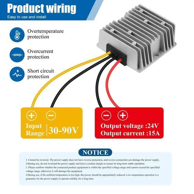 Perfectly adapted to: golf carts / solar energy storage / AGV robots / marine power. ^^ Built in fuses and comprehensive protection: 72V to 24V 15A step down converter with integrated fuses, overload protection, overheating protection, and short circuit protection, it can automatically shut down to protect itself and your valuable connected devices from potential damage. Safety is our top priority.
