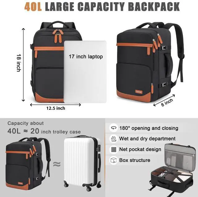 USB Charging Port Stay Powered AnywhereEquipped with a built-in USB charging port, this travel laptop backpack allows you to charge your devices on the go. Simply connect your power bank inside and plug in your cable externally ideal for daily commutes, business trips, or long flights ^^ Spacious 40L Capacity Organized and EfficientDesigned with multiple functional compartments and a roomy interior, this 40L backpack fits a 17 laptop, clothes, and daily essentials with ease. Keep your items neatly organized whether you're heading to work, or a weekend getaway ^^ Water-Resistant & Durable Built to LastCrafted from high-density polyester with reinforced stitching, the backpack offers excellent water resistance and long-lasting durability.