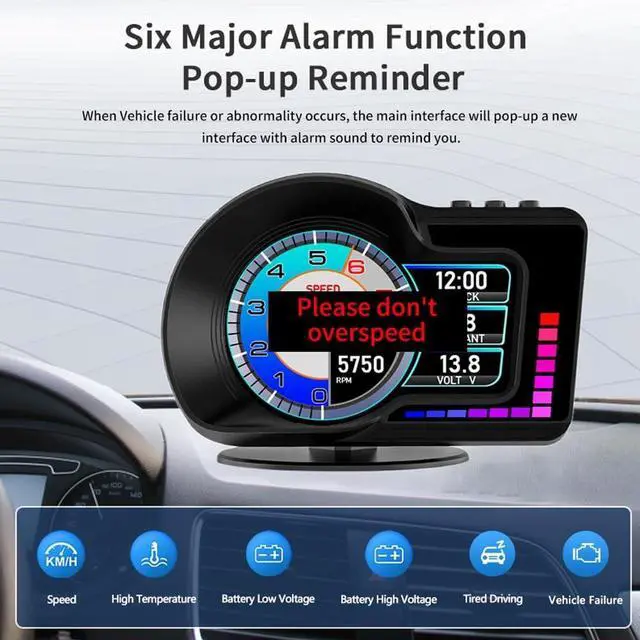OBD2+GPS System 2 in 1This car heads up display has OBD2 mode & GPS gauge dual system, which can display car data intuitively on the product screen. You don't need to look down to view your car data during driving, keeps you safe on the go. ^^ OBD2 Gauge DisplayPowerful hud display can display vehicles speed, water temperature, oil temperature, voltage, fuel consumption, RPM, clock, one-way driving distance, one-way driving time, travel direction, altitude, latitude and longitude, acceleration test, brake test, supports speed alarm to avoid speeding ticket, detect and eliminate fault code, high water temperature alarm, lower battery alarm, fatigue driving reminder.
