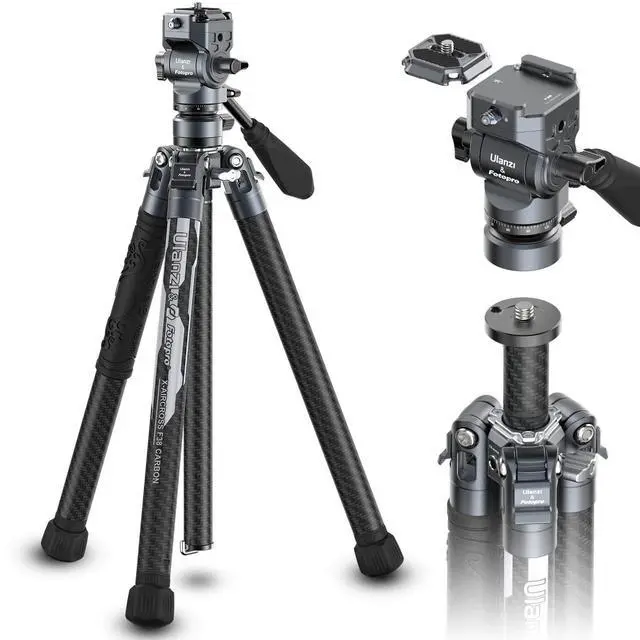 Portable, Stable, Quick and Compact Professional Camera Carbon Fiber Tripod: Only weight 2.38 Ibs/ 1.08 kg, but max load up to 22 lbs / 10 kg; Height from 15.9 in (with head) to 61.4 in; Built-in stowable phone clip; Detachable two-section center column for ultra-low angle shooting or inverted shooting; Fluid head with F38 quick release ^^ Quick Switching of