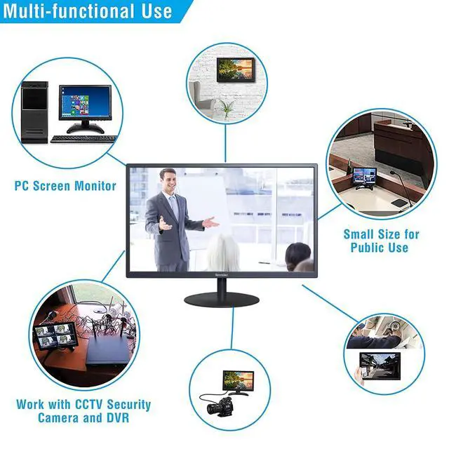 ^^ Support multiple video input interfaces The monitor has BNC/VGA/HDMI/AV/USB interface and audio output and input. BNC for CCTV surveillance system; multimedia playback of movies and photos by connecting to a USB stick; HDMI to improve picture quality or for games; VGA for PC monitors, working as a second display when handling documents or distributing displays; AV input for rear view camera or VCR. ^^ Built-in speakers + wall-mounted designIt adopts dual built-in speaker design and also provides high-quality stereo surround sound, giving you a better visual experience. It also supports wall mounting (VESA 75x75), giving you more options for how you use your space.