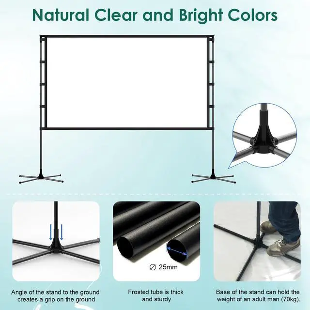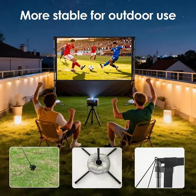 Pair it with a good projector for that "holy cow" moment when the picture appears ^^ Rock-Solid Stability 2 Water Bags Included Tired of flimsy stands that wobble in a breeze? Our heavy-duty metal projector screen with stand comes with two water bags (fill them on site) to lock it down. Tested to withstand outdoor normal windso your movie night or big game doesn't get ruined by a sudden gust ^^ Ultra-Portable & Folds into a Car Trunk Foldable projector screen weighs just 4.9 kg ( 10.8 lbs) lighter than most. Disassembles and folds into the included storage bag, then toss it in your trunk for camping, tailgating, or beach movie nights.