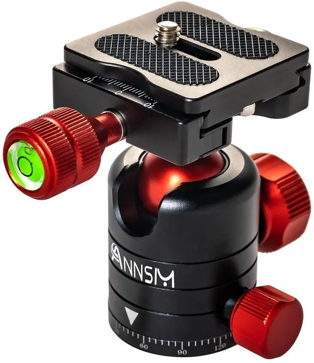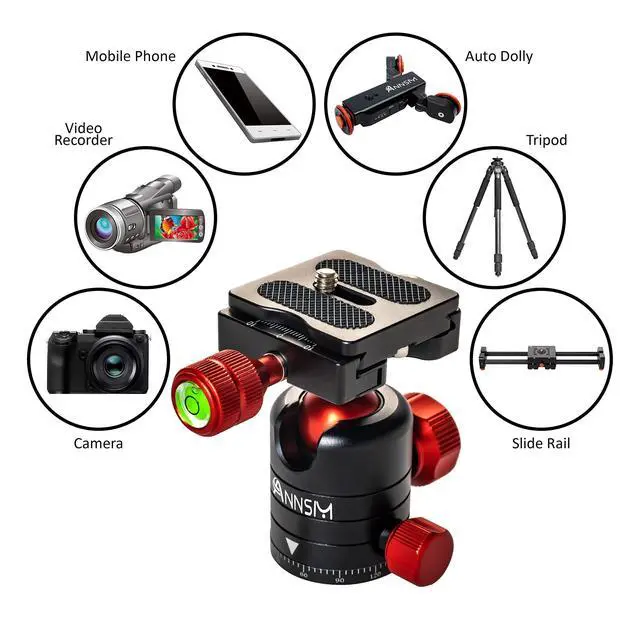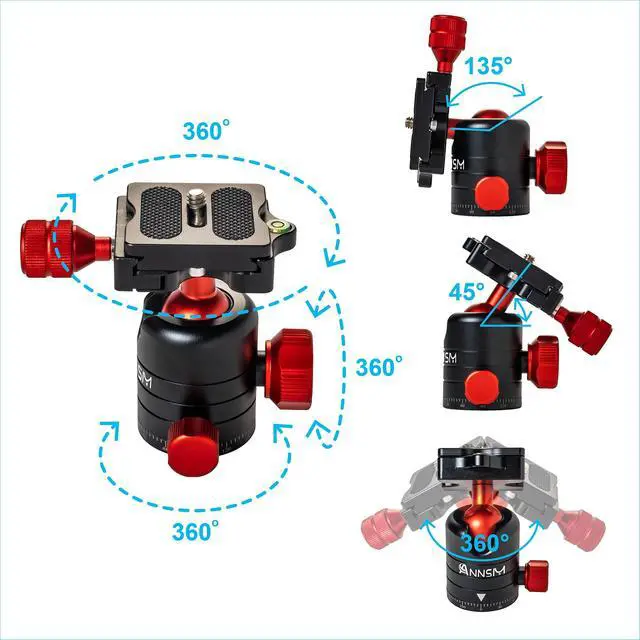 Arca-Swiss Clamp and QR PlateCan quickly mount your device onto this tripod head with the quick release plate or other devices with standard 38mm width slot. ^^ 360Swivel and Pan RotatableU-shaped notch ball head design, you can easily switch from horizontal mode to vertical shooting mode. ^^ PRECISE CONTROL It includes 2 bubble levels which supports both horizontal and vertical shooting. It also includes calibration scales on panning base and QR clamp for easily repeating the position for shooting. ^^ Safe and StableEquipped with 3 knob control buttons for adjustment, which can ensure smooth rotation and tightly lock the position.