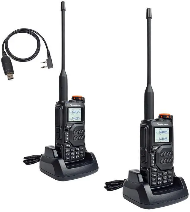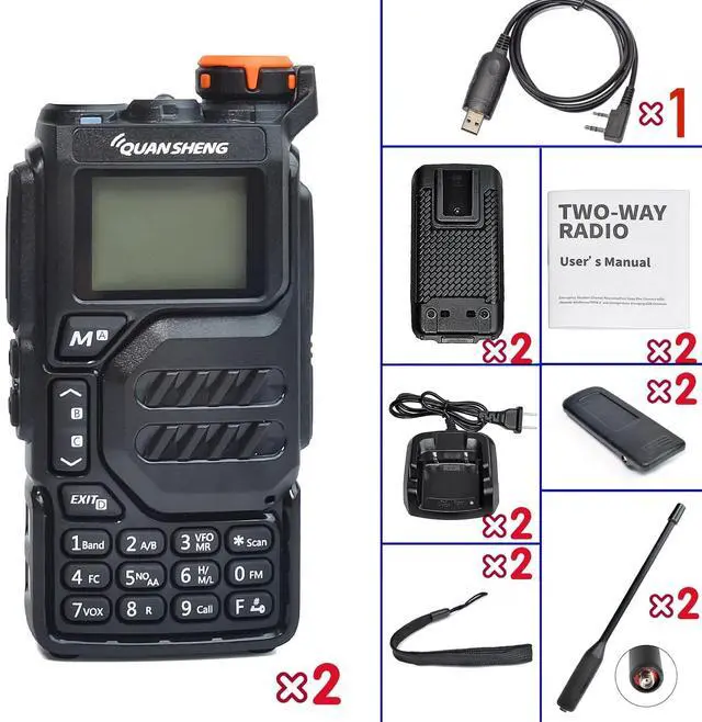 Package Includes: 2*QUANSHENG UV-K5 and antenna, 2*1600mAh Li-ion Battery, 2*US Charger, 2*Belt Clip, 2*Hand String, 2*User Manual, 1*Programming Cable