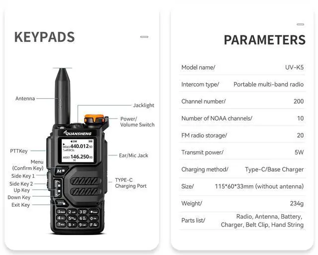 Main Features: UHFand VHF Transmitting&Receiving/Fast Copy One Channel/VOX/CTCSS DCS/Wireless Radio Replication/AM&FM Aviation Band Receiving/Frog Sound Tail Signal/Cross-band Intercom/NOAA Emergency Weather Receiver /Power-on Password/Support CHIRP ^^