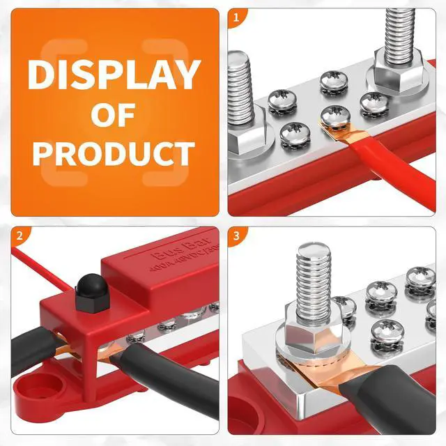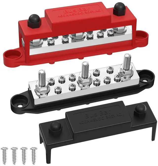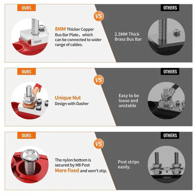 Superior Material: The 400A bus bar terminal block features 8mm( 0.32" ) thicker copper bus bar plate with stainless steel studs and nuts. Red Positive Busbar and Black Negative (Ground) Busbar as a pair ^^