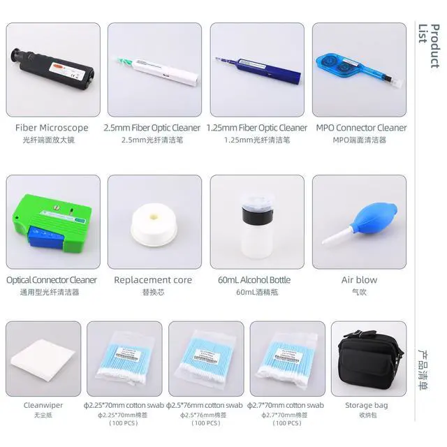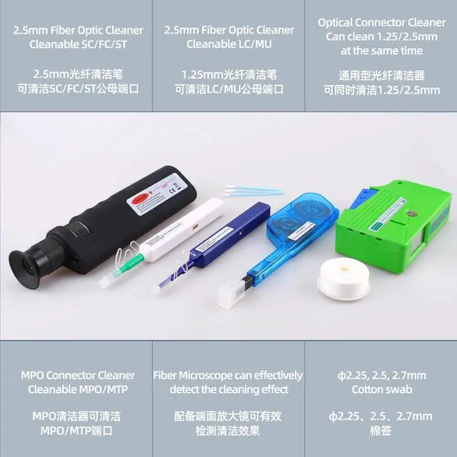 This comprehensive fiber optic cleaning kit is engineered for technicians and installers who demand precision and reliability. It provides the essential tools for maintaining optimal performance in SC, LC, and FC connections, preventing data loss and signal degradation caused by contaminants.