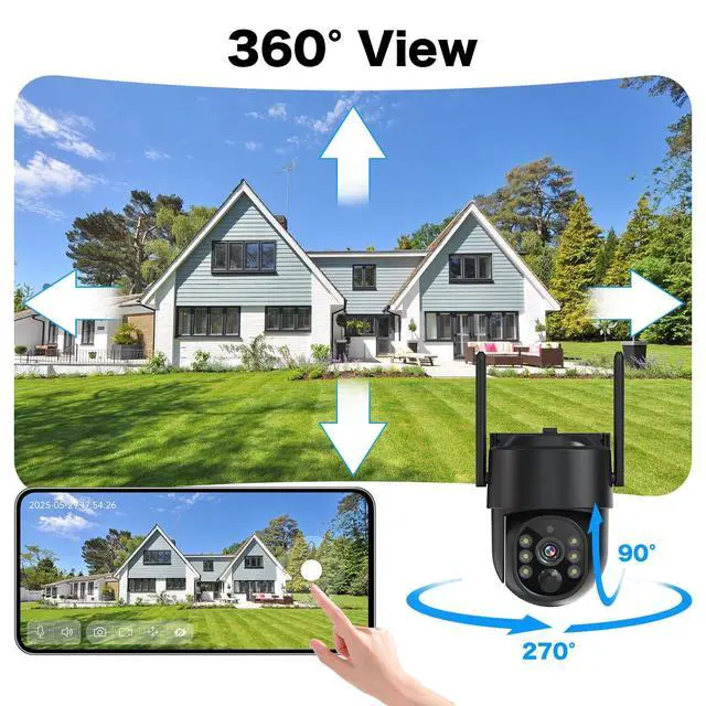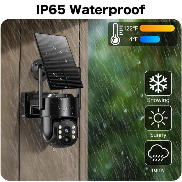 Enjoy uninterrupted security surveillance without any hassle. ^^ 360 Full View & IP65 Waterproof This PTZ outdoor security camera has a 355 horizontal and 100 vertical rotation range, allowing it to capture wider areas and record crystal-clear videos. IP65 waterproof rating and ability to operate in temperatures ranging from -4F to 121F, make it ideal for use in various weather conditions, ensuring the safety of your home at all times. ^^ PIR Motion Detection & 2-Way TalkWith the sensitive PIR motion sensor, this outdoor cameras can enhance human-like recognition to reduce false alarms.