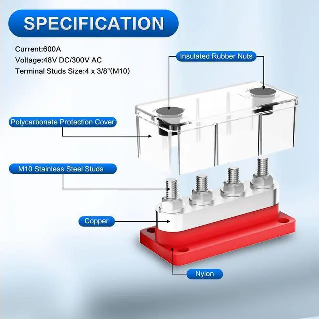 Material: The battery distribution block is made of Tin-plated copper, which has good electric conduct performance and sturdy rust-resistant; The base is made of flame-retardant polycarbonate (PC) base reinforced to protect your safety, ensures great mechanical strength and durability ^^