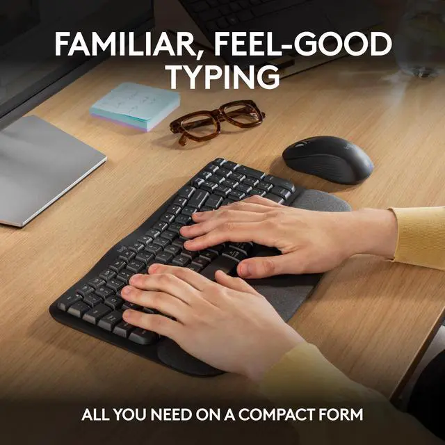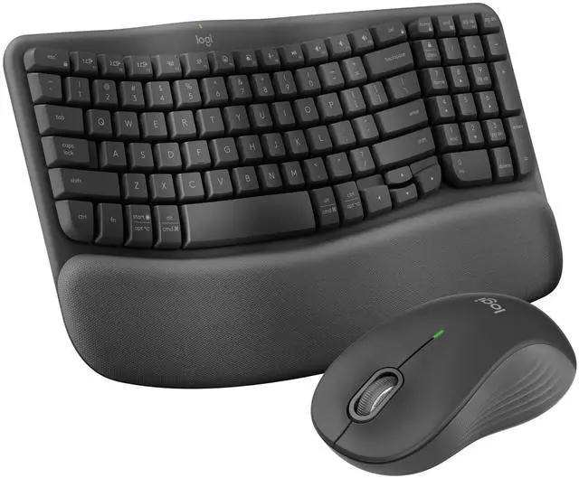 Experience day-long comfort and productivity with this wireless ergonomic keyboard and mouse combo. Typing feels instantly familiar on Wave Keys' wavy keyframe design. The cushioned keyboard palm rest lifts pressure and improves wrist support. The Signature M550 L Wireless Mouse features a contoured shape and rubber side grip to keep medium- to large-sized hands comfortable throughout the day. This wireless keyboard and mouse combo is made with recycled plastic (10) and connect easily using Bluetooth or the included Logi Bolt receiver. The ergonomic keyboard has up to 3 years of battery life, while the mouse has up to 2 years of battery life using the included batteries (3).