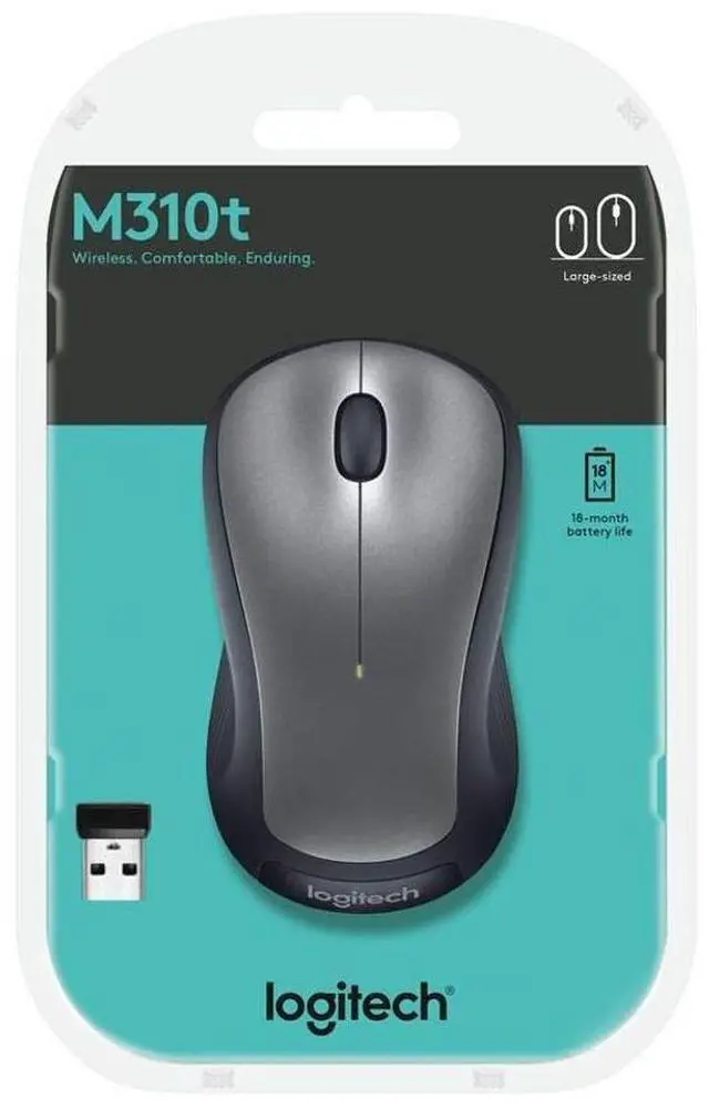 The Logitech Wireless Mouse M310 is the easy-to-use, full-size mouse that feels just right. It feels good in either hand even after long hours of use thanks to its hand-friendly, contoured design with soft rubber side grips. The plug-and-forget nano-receiver is small enough to stay in your USB port so you wont lose it and delivers reliable Logitech Advanced 2.4 GHz wireless connectivity. A 18-month battery life* means less hassle. Navigating is simple too with smooth, responsive tracking. And you get the high quality and reliability thats made Logitech the global leader for mice plus a three-year guarantee.