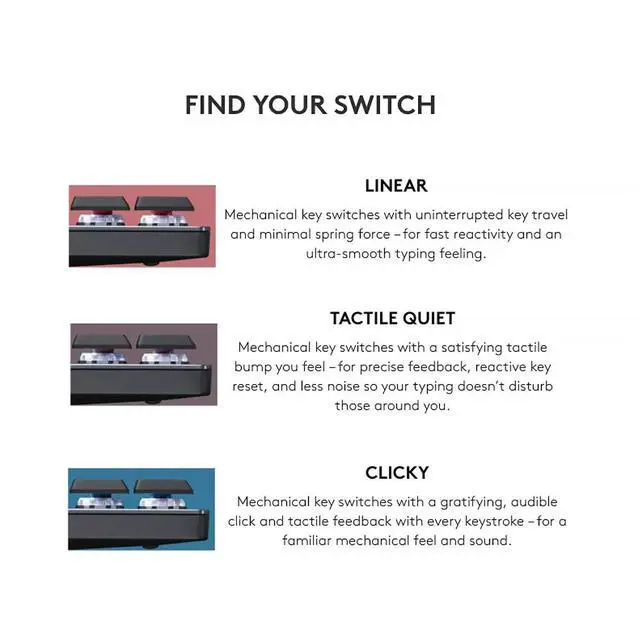 Logitech MX Mechanical Wireless Illuminated Performance Keyboard Introducing MX Mechanical - a full-size keyboard with extraordinary feel, precision, and performance. Low-profile mechanical typing delivers satisfying feedback in your choice of key switches Tactile Quiet, Clicky, or Linear. MX Mechanical is crafted for ergonomic comfort, with smart illumination and easy-switch allowing you to connect up to 3 devices and stay in your flow for hours.